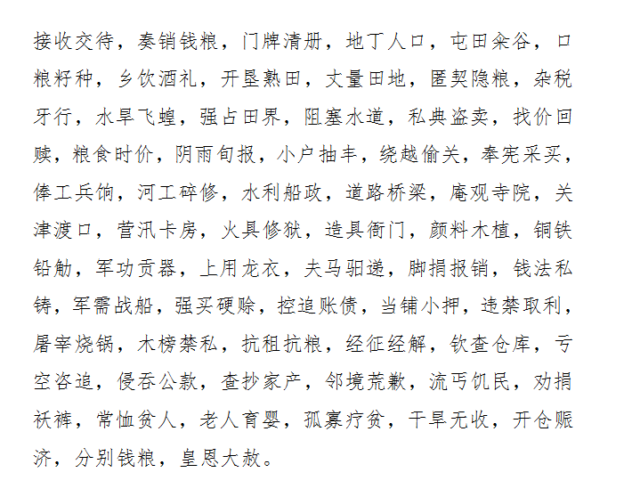 1.征收赋税。查阅清朝官方《赋役全书》所记载的人数、田亩数等以及每年向上级部门汇报的关于税收明细的"奏效册"等是基础工作,接下来是以"鱼鳞图册"为依据查清土地数量,在征收赋税前要向农民下发通知,到四月份正式开征,还要处理不交纳粮食者,事务非常琐碎。后来,又出了专门负责税收的征比师爷,有时钱谷师爷会委托征比师爷代为征收赋税。