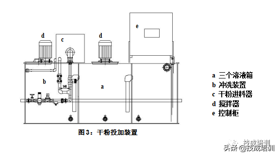 2.干粉配制装置是由用于干粉的贮存、进料、浸湿、溶解和熟化件组装为一体的整体设备。整套设备包括封闭的3个溶液箱(a),带有内冲洗装置的水管路(b),干粉进料器(c),搅拌器(d)和控制柜(e)。