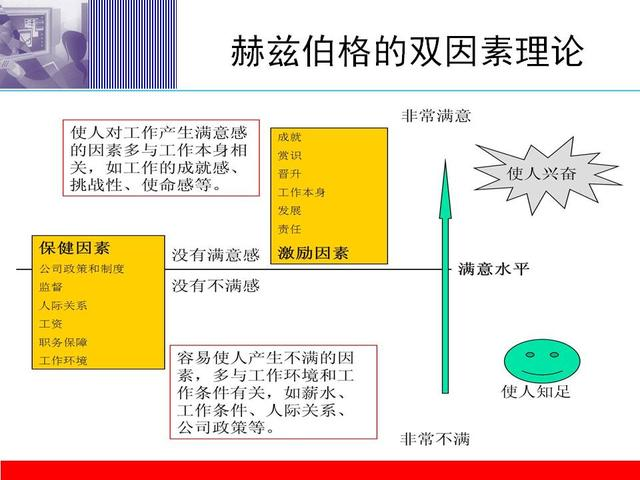 根据赫茨伯格的研究发现,经理人应该认识到保健因素是必需的, 不过它一旦使不满意中和以后,就不能产生更积极的效果。只有激励因素才能使人们有更好的工作成绩。