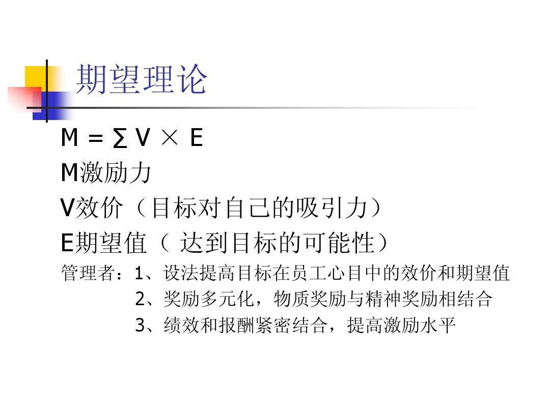 美国心理学家弗鲁姆于1964年提出了期望理论。该理论认为,激发的力量来自效价与期望值的乘积,即: