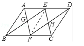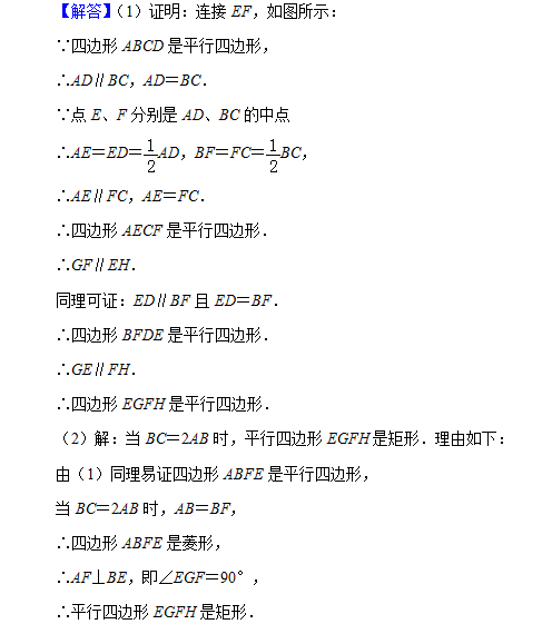 【分析】(1)分别证明四边形AFCE是平行四边形,四边形BFDE是平行四边形,得到GF∥EH,GE∥FH,则可证四边形EGFH是平行四边形.(2)先证明四边形ABFE是菱形,得到AF⊥BE,即∠EGF=90°,利用一个角为90度的平行四边形为矩形判定。