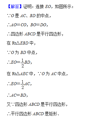 例4.如图,AC、BD相交于点O,且O是AC、BD的中点,点E在四边形ABCD外,且∠AEC=∠BED=90°,求证:四边形ABCD是矩形.【分析】连接EO,题目已知O为BD和AC的中点,所以四边形ABCD是平行四边形,再由斜边上的中线等于斜边的一半,得到AC=BD,根据对角线相等的平行四边形为矩形证明结论。