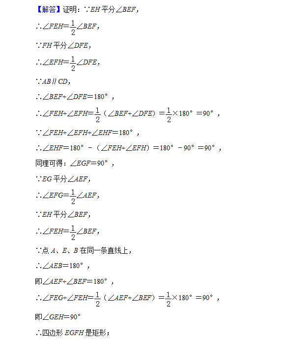例5.如图,AB∥CD,点E、F分别在AB、CD上,连接EF.∠AEF、∠CFE的平分线交于点G,∠BEF、∠DFE的平分线交于点H.求证:四边形EGFH是矩形.【分析】利用角平分线的定义,根据∠AEF、∠CFE的平分线交于点G,∠BEF、∠DFE的平分线交于点H,可以得出∠EHF=90°,∠EGF=90°,∠GEH=90°,利用四边形EGFH是矩形;