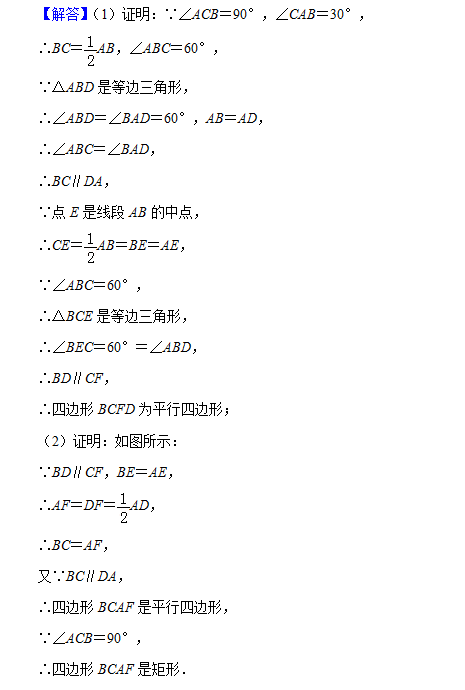 【分析】(1)由△ABC是一个角为60度的直角三角形和△ABD为等边三角形,通过60度的角相等,得到两组平行线,从而得出结论;(2)证出BC=AF,得出四边形BCAF是平行四边形,再由∠ACB=90°,利用一个角为90度的平行四边形为矩形判定四边形BCAF是矩形。