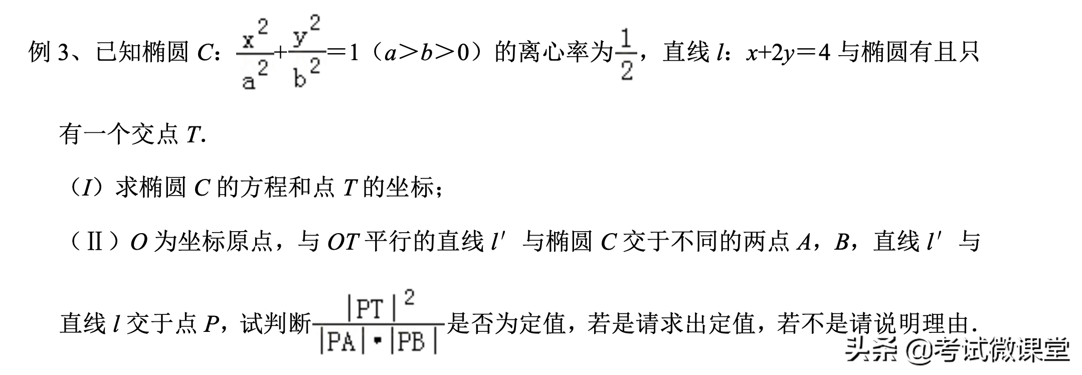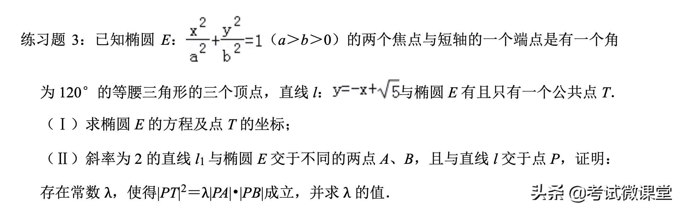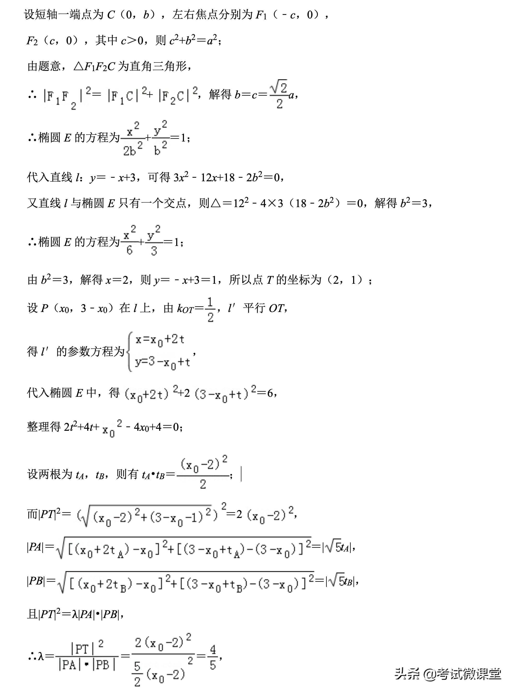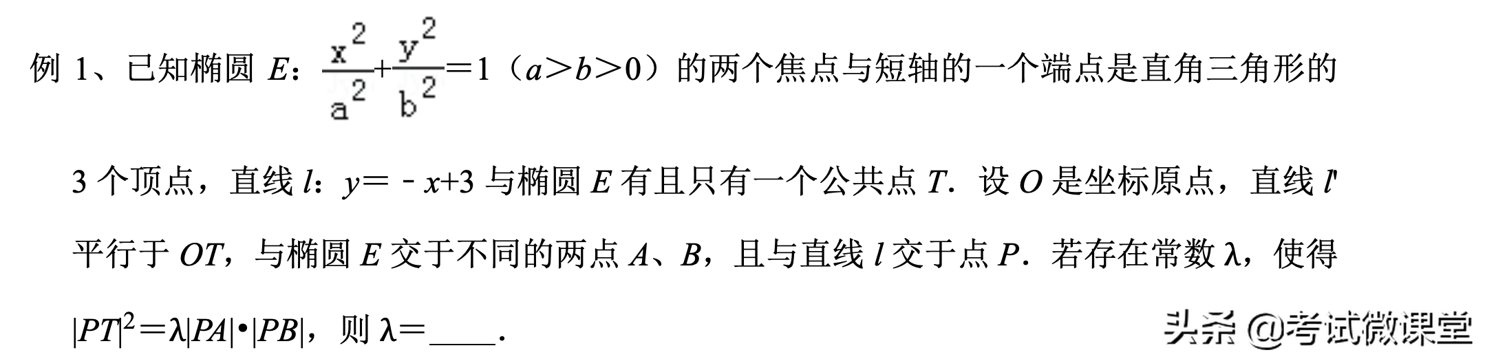 【分析】根据已知条件中“两个焦点与短轴的一个端点是直角三角形的3个顶点”,可求椭圆离心率;直线PT斜率是-1,可知其倾斜角。求出点T坐标,可得直线OT的斜率,和直线AB的倾斜角。此题符合椭圆中的“切割线定理”,代入公式λ即可。