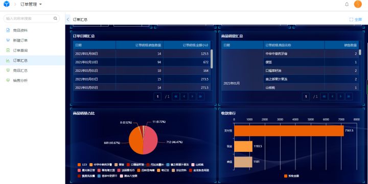 在订单管理功能应用中,汇总了所有商品的资料信息以及历史订单信息,可视化的图表呈现有利于掌握各项指标的当前趋势。