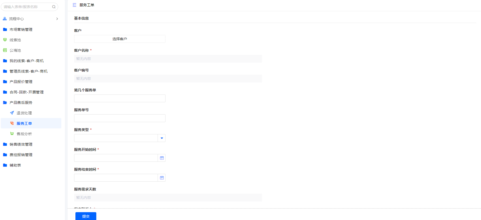 退货处理是客户需要退货时用到的表单,根据客户及对应合同填入退货原因及金额等信息,售后分析可在售后分析报表里面查看。根据客户需求指派售后技术人员上门服务,在服务工单走指派流程。