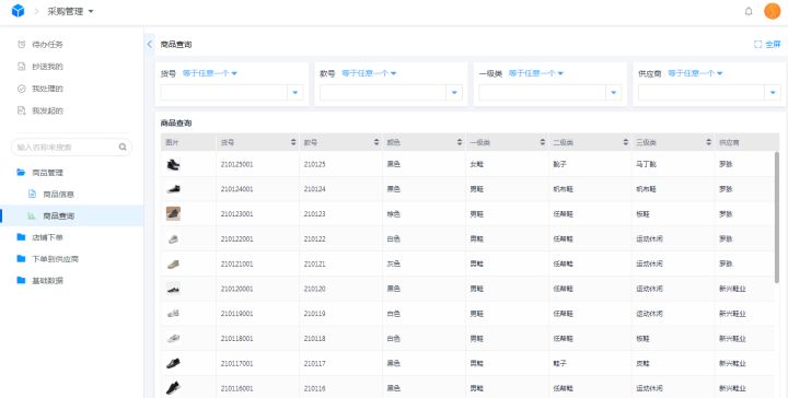 上传的商品信息,根据货号、款式、供应商等关键字段可以实现筛选查询,快速找到需要的商品信息详情内容。