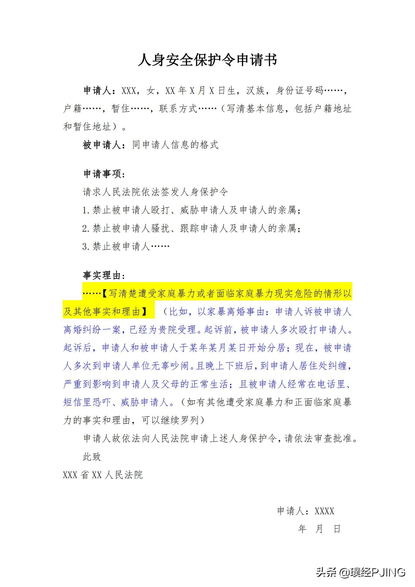 第四条 申请人身安全保护令,应当向申请人居住地、被申请人居住地、家庭暴力发生地的基层人民法院提出申请。家事纠纷案件二审期间,申请人提出申请的,应当告知并协助申请人向原一审人民法院提出。第五条 人身安全保护令申请书应载明以下内容:1、有明确的申请人姓名、通讯住址或单位;