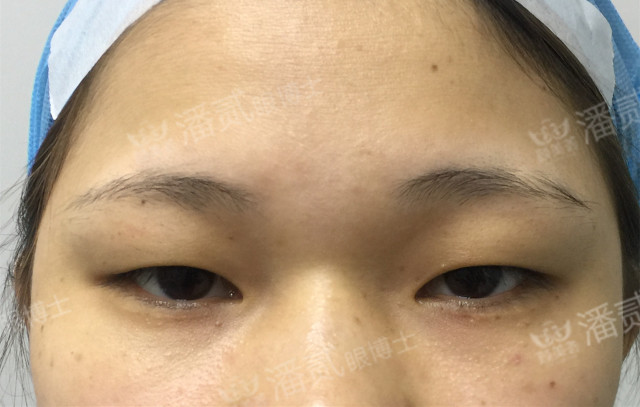 美女原来单眼皮,眼窝深,眉弓骨高凸,外侧眶骨缘低,上睑组织臃肿肥厚,黑眼珠暴露偏少,眼睛无神。