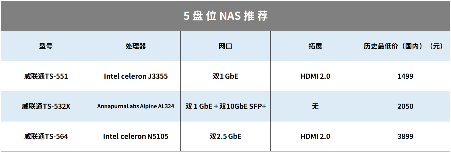 威联通 TS-551 价格某多常年 1499 元,3 个 3.5 英寸盘位和 2 个 2.5 英寸盘位,x86 架构,搭载了 Intel Celeron J3355 双核 2.0GHz 处理器( 睿频 2.5GHz ),标配内存为 DDR3L 4GB,拥有 HDMI 接口,支持 4K 30Hz HDMI 影音输出以及进阶的虚拟化功能与多样化生产力应用程序。性价比非常高!