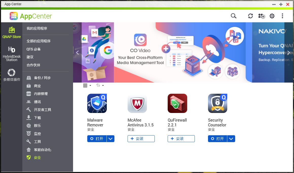 威联通对于安全方面看的非常重,一共出了Malware Remover、McAfee Antivirus、QuFirewall、Security Counselor几个工具,大家可以看看。