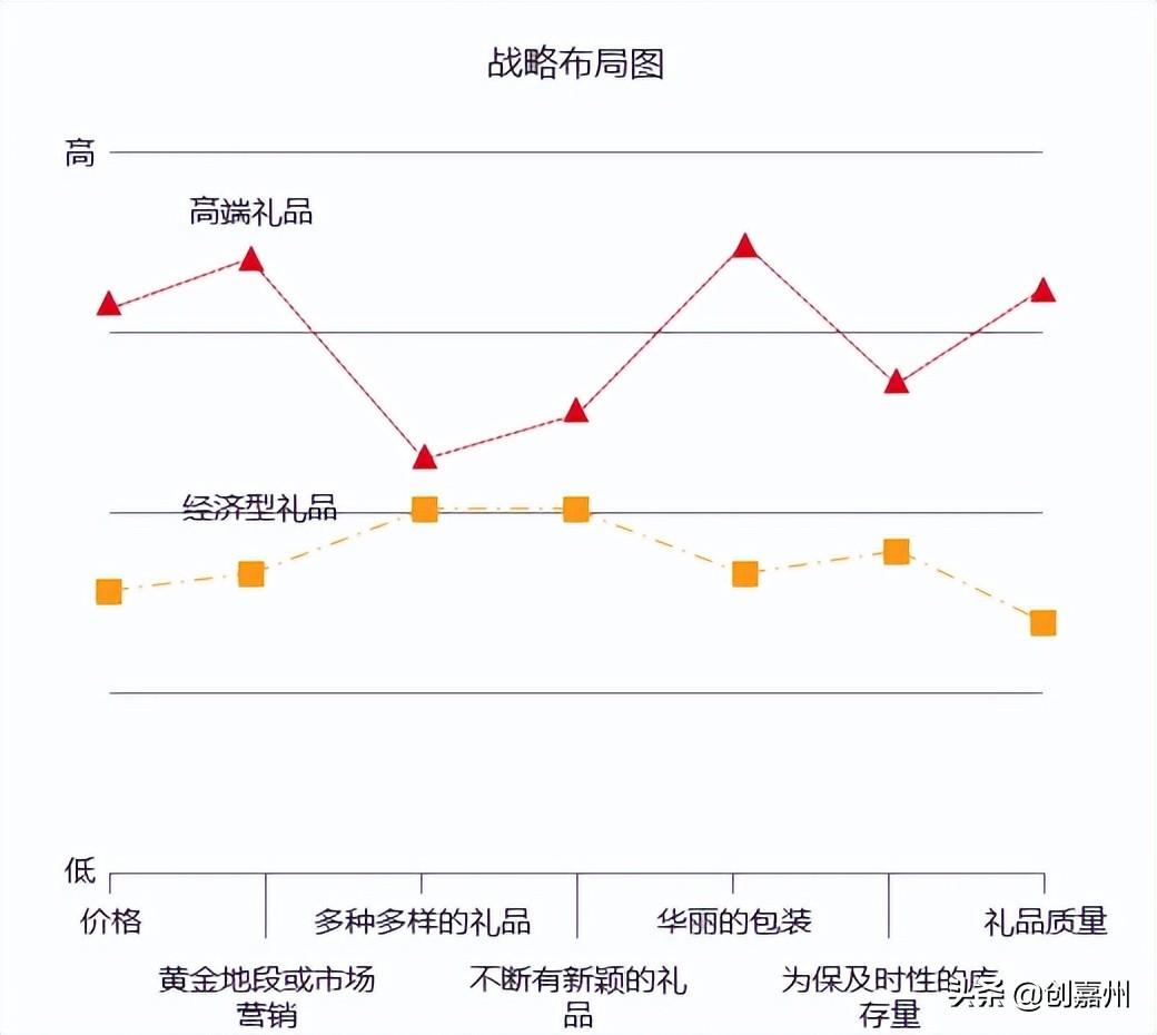 横轴:是竞争或投资所注重的各项元素;纵轴:反应企业在此投入多少,也侧面说明客户在这些元素上获得多少。