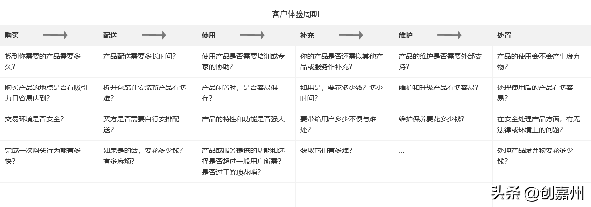 从客户体验周期看,过程有购买、配送、使用、补充、维护、处置;