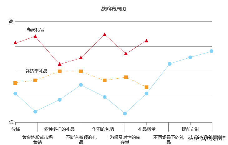 战略布局图可描绘出一家企业在产业竞争元素上的相对强弱,借此亦可捕捉已知市场的竞争现状,窥探竞争对手的施力点。