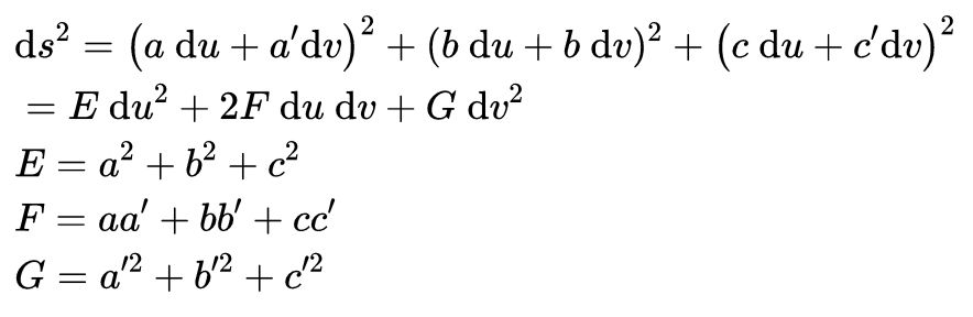 高斯通过使用欧拉提出的一个曲面的参数方程,开始对曲面的处理。高斯证明了,一个曲面的属性仅依赖于E、F和G。