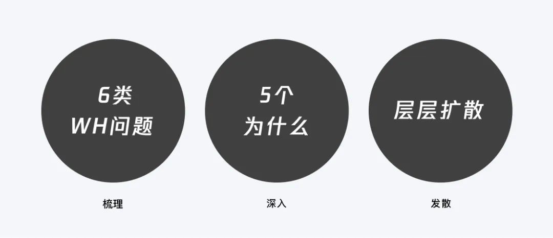 如果五个为什么是向内层层递进,那层层扩散就是向外发问。以最为基础的命题问题作为中心点扩散,向外展开相关因素:产品的核心问题,相关结构技术,外部文化和法规。