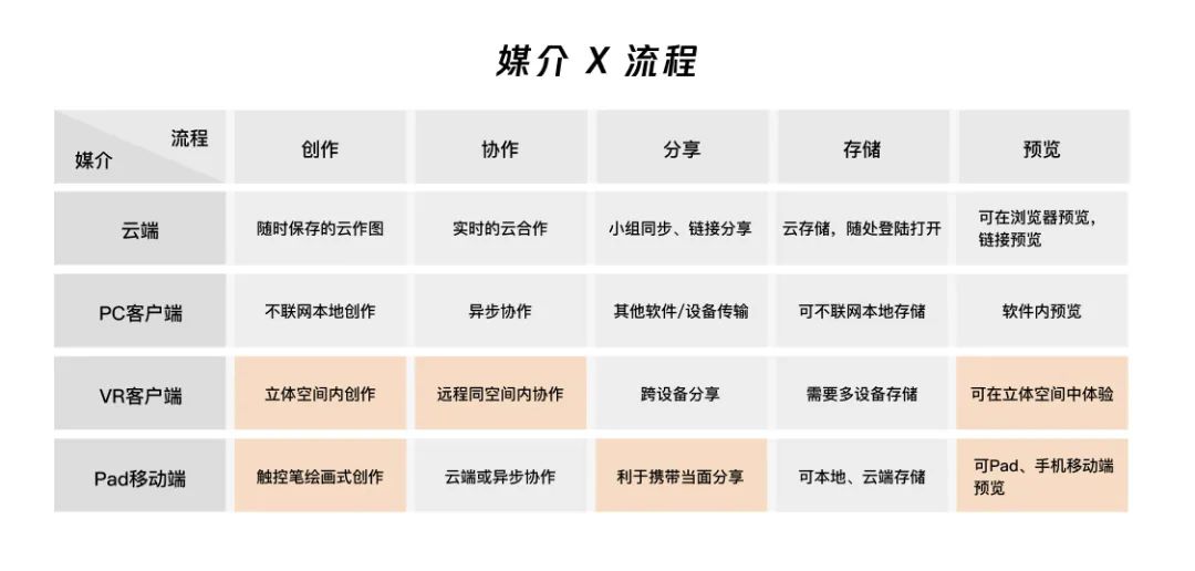 3D建模的工程经常会涉及到协作分享等流程,选择以整体设计步骤为X轴。从这个矩阵开始进行发散,交叉重合的部分思考结合出的设计,再选取其中的亮点向产品方向创新。
