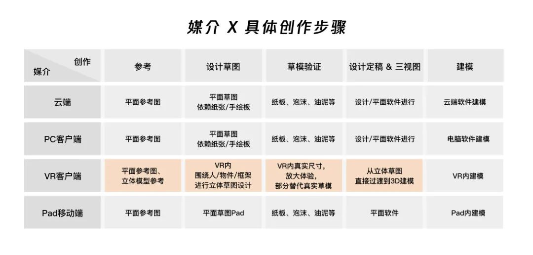 针对每一个流程步骤,可以聚焦到里面的每一个分步骤,探索亮点。比如创作阶段的流程可以展开到具体设计到建模的步骤。当把步骤进行分解之后,可以发散出各个阶段利用VR的创作优势。