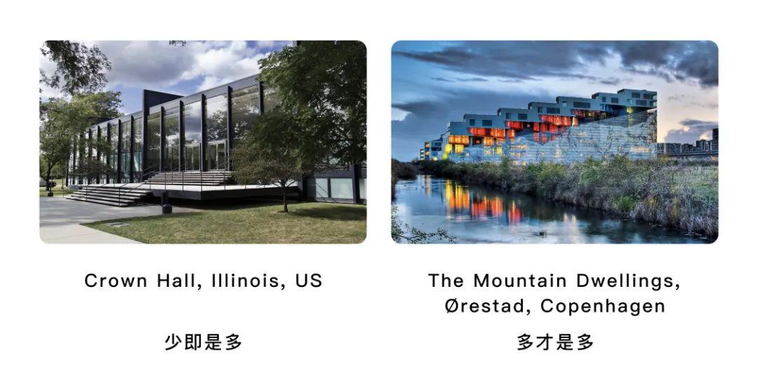 现代主义建筑大师Ludwig Mies Van der Rohe提出“少即是多(Less is more)”的极简设计理念改变了很多产品和建筑设计,之后许多设计师都遵循”少即是多原则进行设计,罗伯特·文丘里 (Robert Venturi)逆向而行从设计思路上“反叛”,开创了“少则无聊(Less is bore)”观念,让设计的建筑更符合街道氛围和文化。
