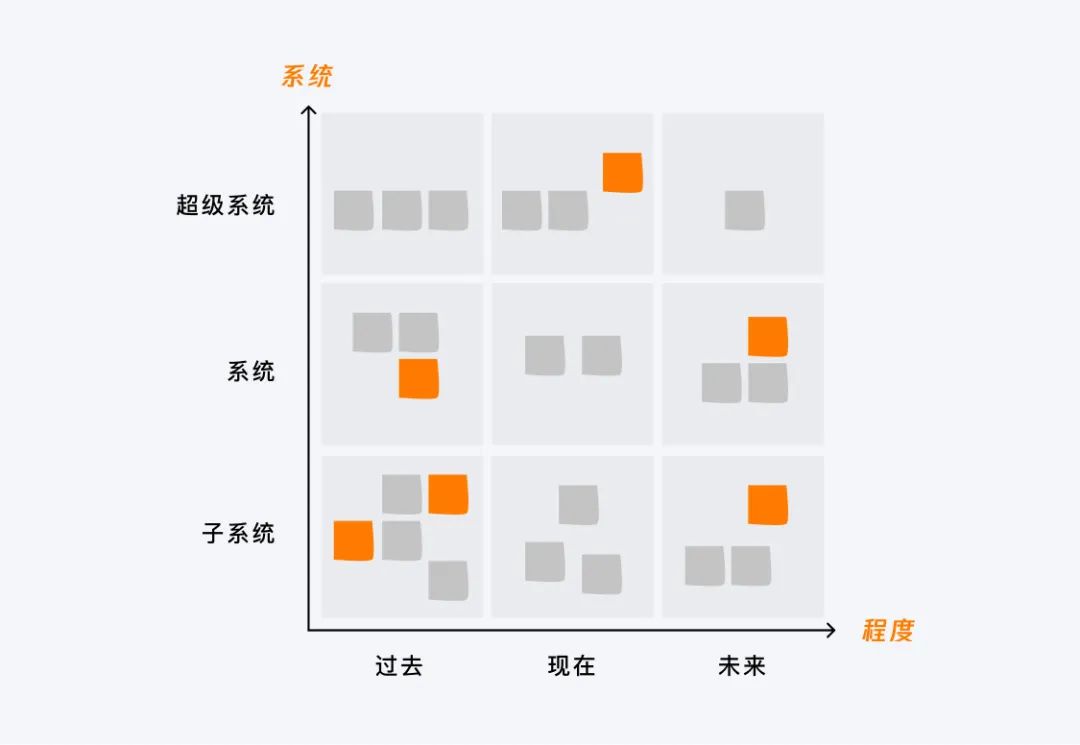 九宫格视窗可以帮助进一步决策,将创意灵感在“系统结构”和“实现时间”两个维度进行排列选择,之后根据需求的资源和达成所需时间进行选择和规划。突破式的创新往往需要大量的时间来完善技术和系统,所以在筛选想法的过程中结合这两个因素,可以保证持续性的创新。