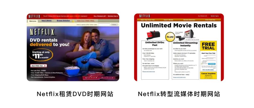 Netflix创新地使用线上下单、往返邮寄的租赁模式,让用户通过免费快递信封租赁及归还Netflix库存的大量影片实体光盘,并以此打败了线下租赁连锁店百视达。