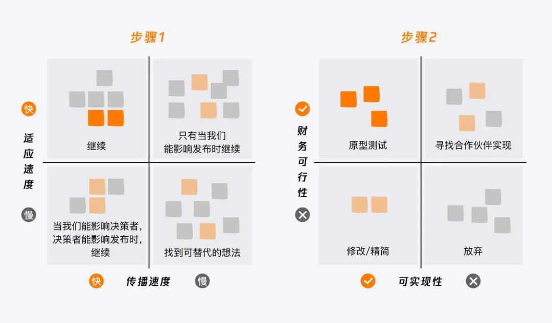 如果你的创意需要在大公司里进行落地和推进,可以使用“传播速度和可实现性”矩阵逐步选择,第一步聚焦适应速度和传播速度,将决策者对产品的影响也放入考察。第二步,审查可实现性和财务可行性,之后做出相应选择和推动。