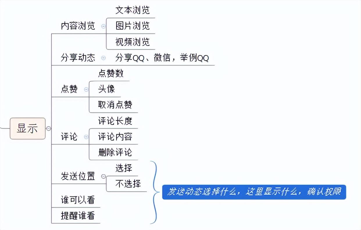 简而言之,就是把你能看得到的功能及功能点梳理出来。公司一般都有产品需求资料,例如需求规格说明书文档、原型图、UI设计图;当没有任何需求资料情况下,可以通过操作软件来熟悉业务。像发送朋友圈,我们可以先功能模块—>再子功能—>再到功能需求细节来梳理,注意一些不明确的需求细节需要及时跟产品确认。大致梳理如下: