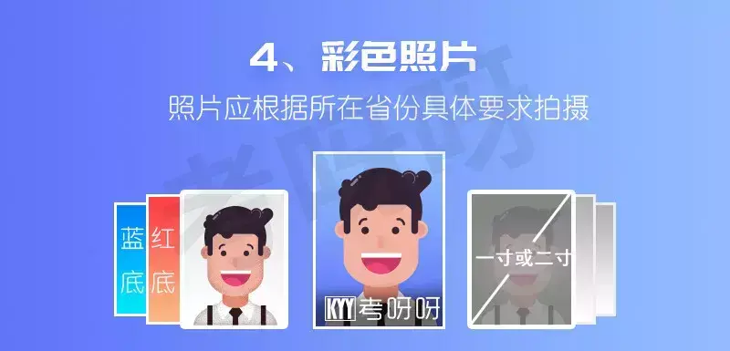 4、照片:近期正面免冠同底彩色照片,一寸的二张、二寸的一张(有的省要求二寸,有的省是一寸,张数各省市也有差异)。