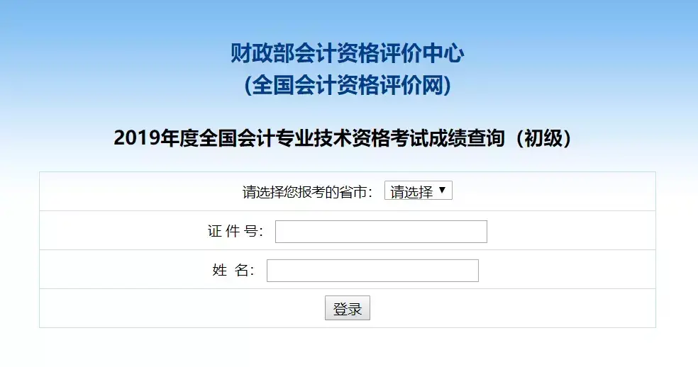 2、选择2019年初级会计职称考试成绩查询入口,然后选择自己所报考的省市,输入证件号查询即可。