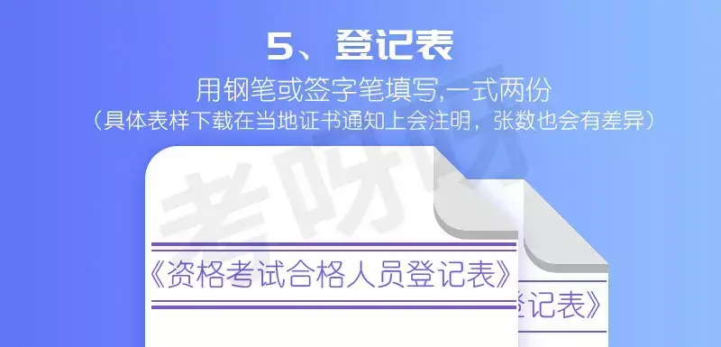 5、登记表:用钢笔或签字笔填写《资格考试合格人员登记表》一式二份(具体表样下载在当地证书通知上会注明,张数也会有差异)。