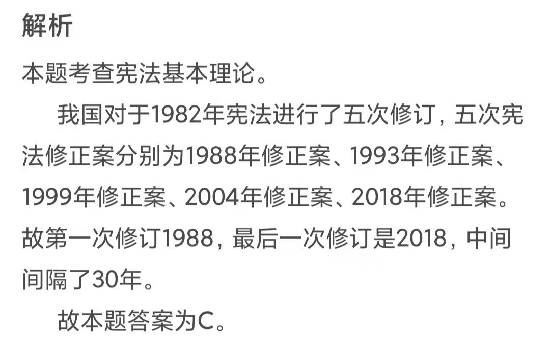 宪法是国家的根本法,是治国安邦的总章程。我国现行宪法是在1982年制定的,并在之后进行了五次的修订,那么第一次对于现行宪法的修订距离最新的一次修订,中间间隔了()年