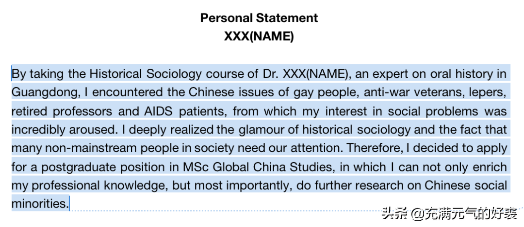 关于文书第二段和第三段,这部分是将申请人自身的经历和背景深挖而产出的,非常个人化的申请理由以及经历陈述。可以从陈述申请专业的理论基础开始,用自己的背景不断向此方向贴合润色,最后用自身实践经历辅助佐证为了申请此专业,申请人做了哪些努力与实践。(由于涉及到隐私,这里就不放出来)