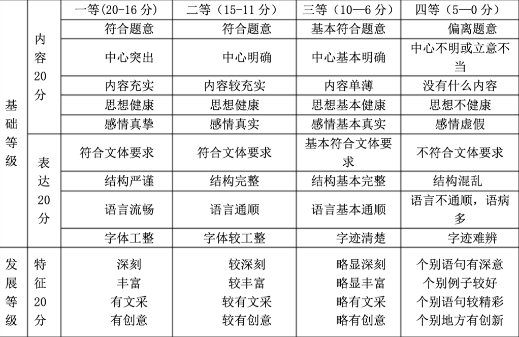 以下是我在百度上随便搜的一个高考语文评分标准,可能不一定那么准确但是也可以拿出来一起探讨一下: