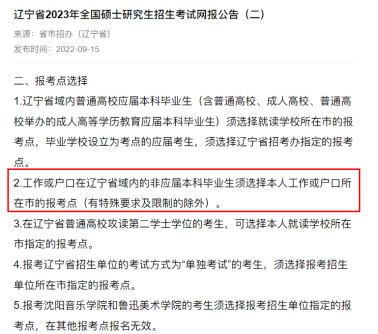 往届生的报考时间为9月26日至27日和10月5日至25日。工作或户口在辽宁省域内的非应届本科毕业生须选择本人工作或户口所在市的报考点(有特殊要求及限制的除外)。