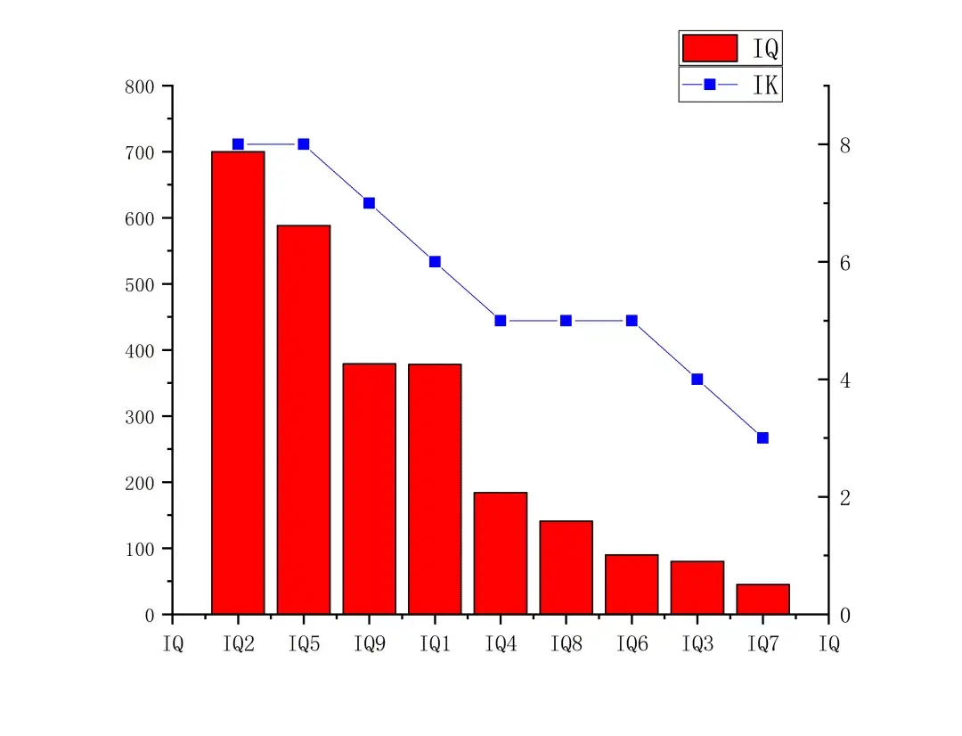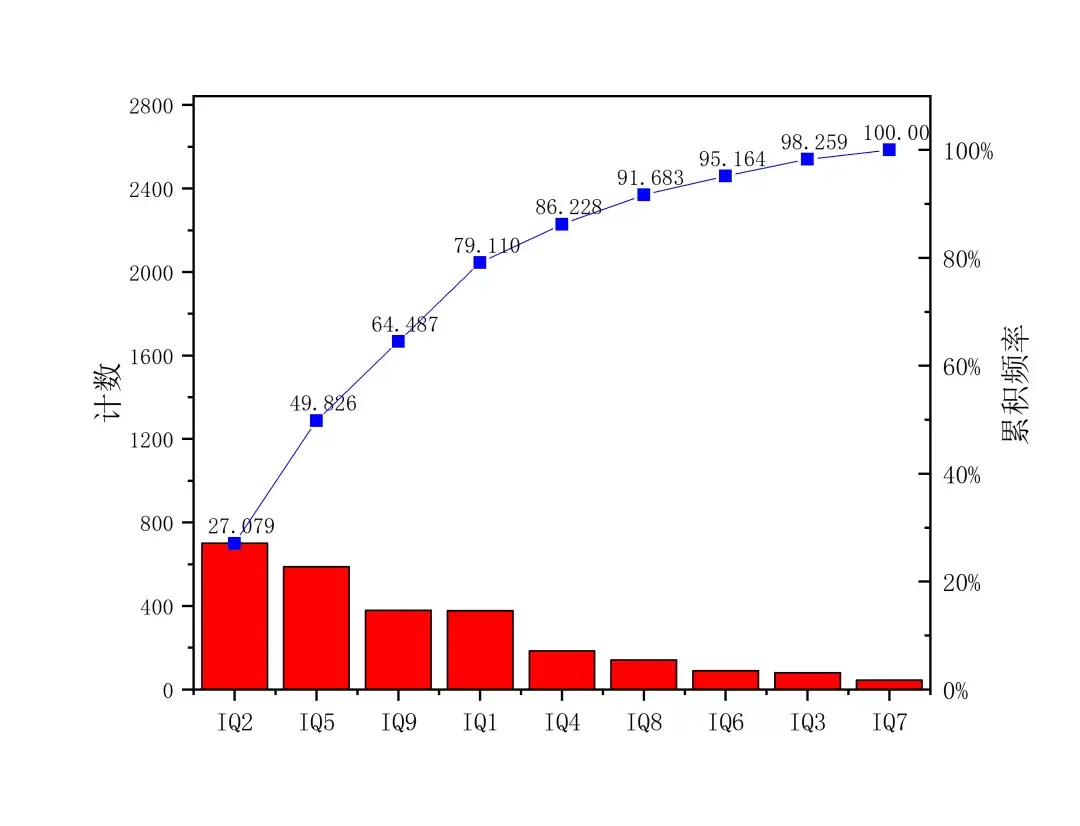 IQ代表货物出货量。把所有的IQ从大到小排列并计算所占百分比,再将排列后的IQ所占百分比依次相加得到累计百分比,最后绘制IQ-ABC分析柏拉图,见图2。找到需要重点后将其设为A类货物重点处理,确保其流通能快速满足客户需求。