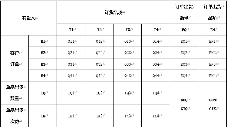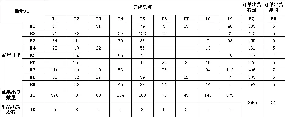 EIQ-ABC分析法由EIQ分析和ABC分类构成。E代表“Entry”件数、I代表“Item”品项、Q代表“Quantity”数量。这种方法从关键要素订单、品项、数量来分析物流运作的方式和确定仓库的储位分配。以4个订单数为例,建立如下EIQ分析表。