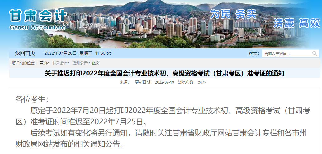 原定于2022年7月20日起打印2022年度全国会计专业技术初、高级资格考试(甘肃考区)准考证时间推迟至2022年7月25日。