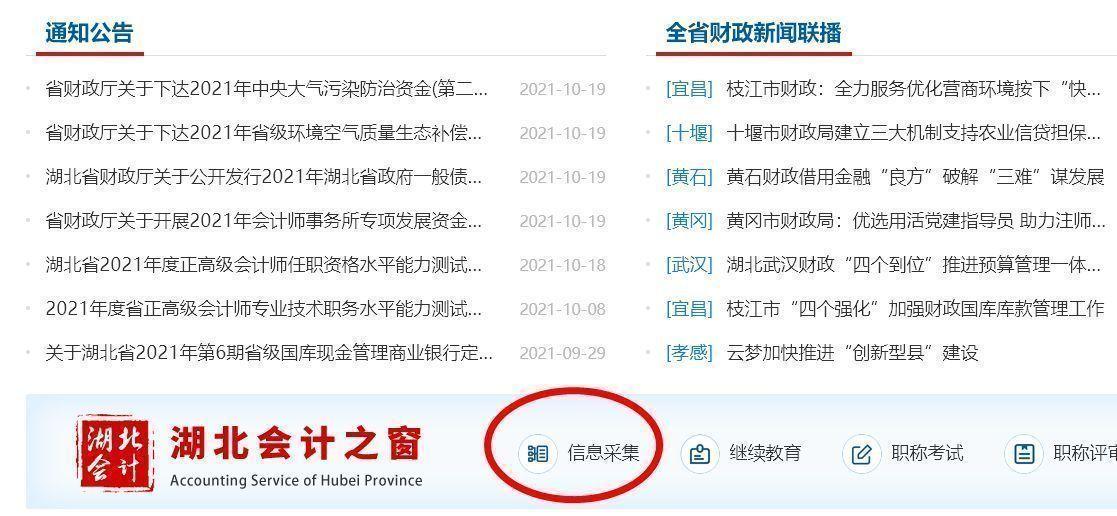 1、首先登录《湖北省财政厅》网站,在首页中部找到“信息采集”入口