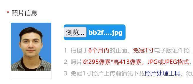 1、拍摄于6个月内的正面、免冠1寸电子版证件照,背景颜色为红色、蓝色或白色; 2、照片宽295像素*高413像素,JPG或JPEG格式,照片大小不超过20K; 3、免冠1寸照片上传前请先下载照片处理工具,须上传处理后生成的照片,未经处理的免冠1寸照片无法正常完成上传操作。