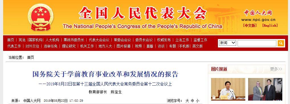 在8月22日举行的十三届全国人大常委会第十二次会议上,受国务院委托,教育部部长陈宝生作关于学前教育事业改革和发展情况的报告。陈宝生回顾了学前教育事业发展总体情况,指出学前教育重点工作情况,并说明了下一步工作考虑。下一步,学前教育领域将重点做好以下几个方面的工作: