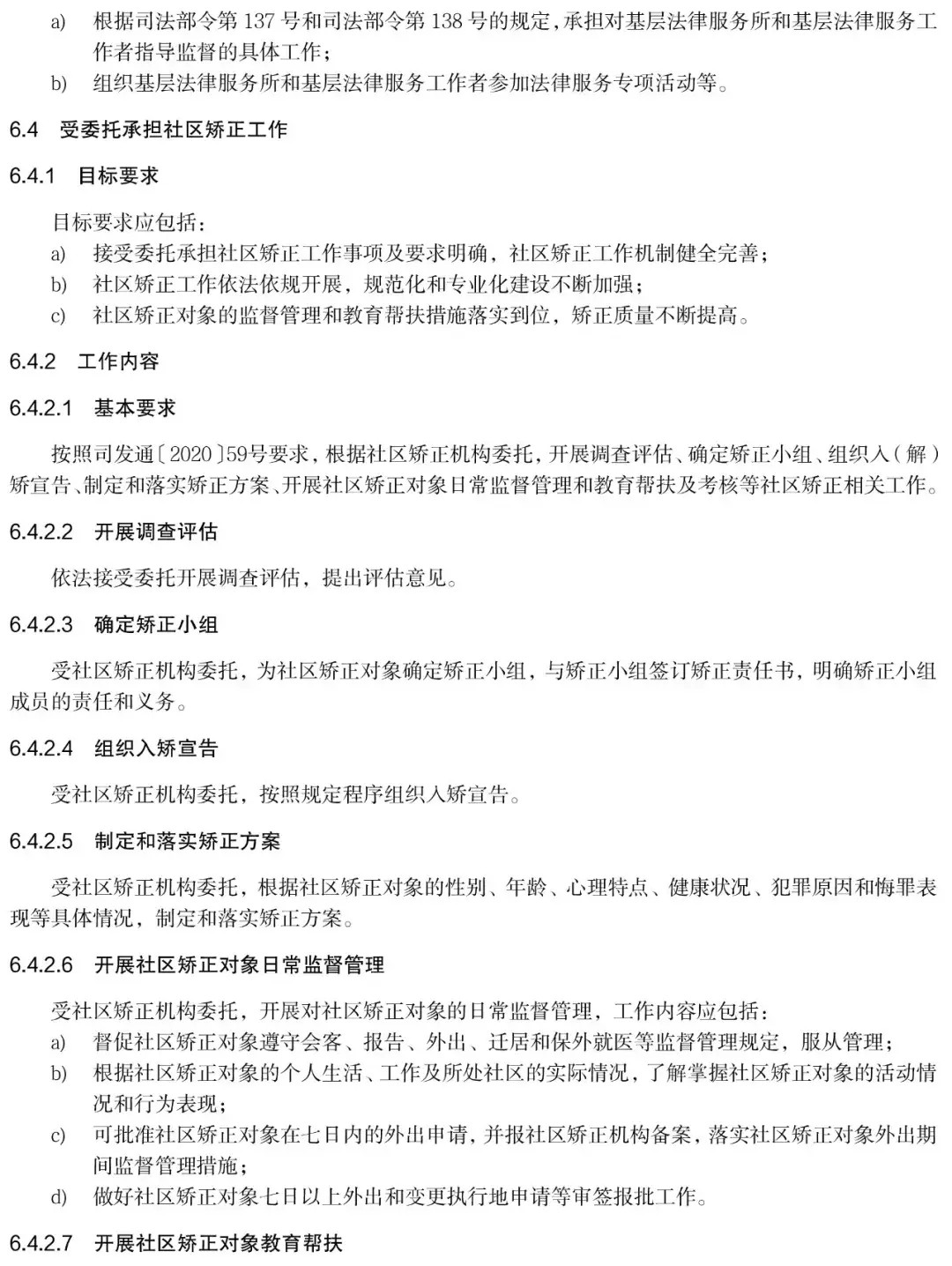 《规范》明确了司法所受委托承担社区矫正工作,基本要求为按照司发通〔 2020〕59号要求,根据社区矫正机构委托,开展调查评估、确定矫正小组、组织入(解) 矫宣告、制定和落实矫正方案、开展社区矫正对象日常监督管理和教育帮扶及考核等社区矫正相关工作。