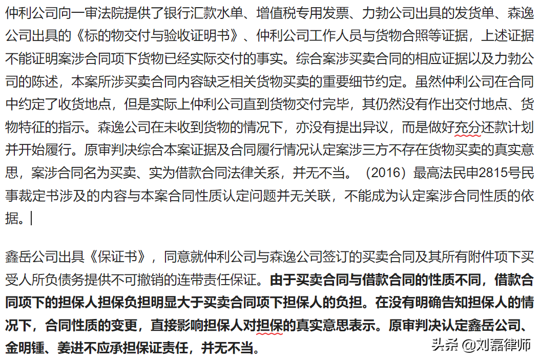 3. 后力勃公司以森逸公司未能如约支付购买价款为由诉至法院,并要求鑫岳公司对此承担担保责任。经法院查明,CCXX号《买卖合同》系“名为买卖,实为借贷”,而鑫岳公司对此并不知情。