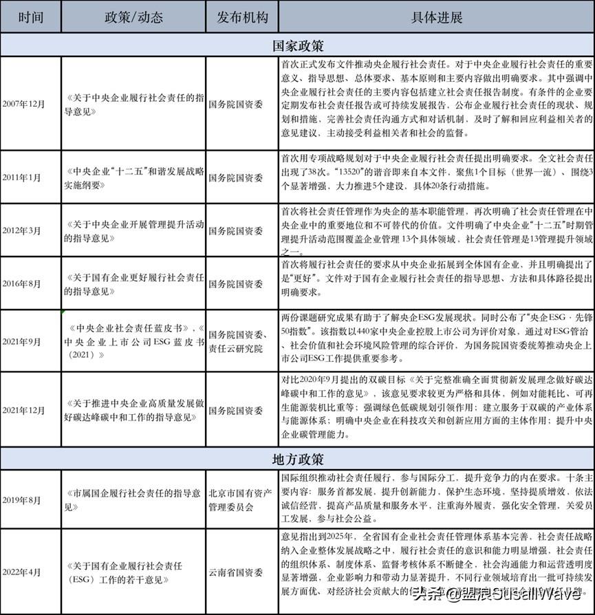 5月27日,国务院国资委发布《提高央企控股上市公司质量工作方案》(以下简称《工作方案》),明确提出央企贯彻落实新发展理念,建立健全ESG体系。其中,《工作方案》强调中央企业集团公司要立足国有企业实际,积极参与构建具有中国特色的ESG信息披露规则、ESG绩效评级和ESG投资指引,为中国ESG发展贡献力量,要推动更多央企控股上市公司披露ESG专项报告,力争到2023年相关专项报告披露做到“全覆盖”。