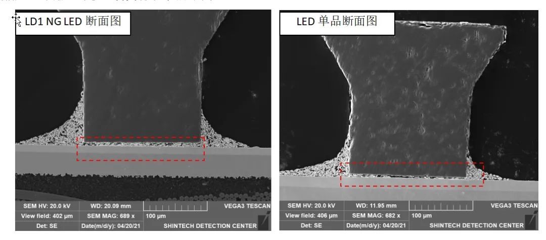 LED单品分析发现晶元底部银胶松脱,说明LED本身制程异常。这种LED在经过回流焊后,其银胶松脱现象可能会存在扩大趋势。