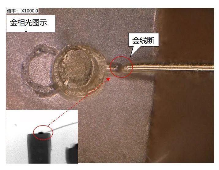 对同批次的LED进行再次确认,锁定对象品。对成品LED进行更换。改善LED制程。LED不点灯失效的原因为LED内部金线断裂,断裂位置靠近金线与支架键合点。从断裂位置以及断裂的状态分析,可以判断金线是受到应力后出现的应力断裂。