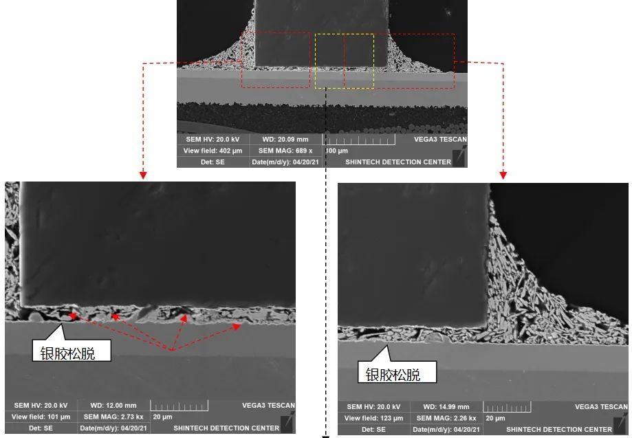 当底部银胶松脱后,其电性能下降,且散热效应降低。