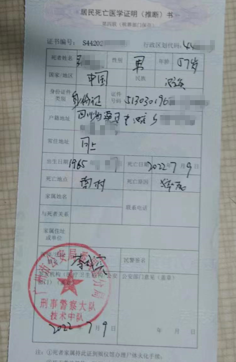 次日一大早,她乘高铁来到河南郑州,然后飞往广州。7月10日晚上8时左右,她和其他亲戚辗转抵达广州番禺区,此时她父亲早已送到当地殡仪馆。