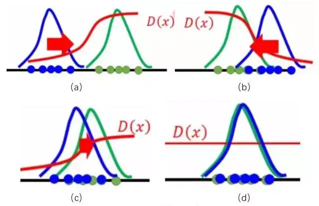 蓝色分布为生成分布,绿色分布为真实分布,D为判别器,GAN从概率分布的角度来看,就是通过D来将生成分布推向真实分布,紧接着再优化D,直至到达图1(d)所示,到达Nash均衡点,从而生成分布与真实分布重叠,生成极为接近真实分布的数据。