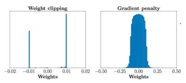 虽然WGAN在理论上解决了训练困难的问题,但它也有各种各样的缺点。在理论上,由于对函数(即判别器)存在Lipschitz-1约束,这个条件难以在神经网络模型中直接体现,所以作者使用了权重剪枝(clip) 来近似替代Lipschitz-1约束。显然在理论上,这两个条件并不等价,而且满足Lipschitz-1约束的情况多数不满足权重剪枝约束。而在实验上,很多人认为训练失败是由权重剪枝引起的,如图3。对此Ishaan Gulrajani提出了梯度带梯度惩罚的WGAN(WGAN with gradient penalty, WGAN-GP)[5],将Lipschitz-1约束正则化,通过把约束写成目标函数的惩罚项,以近似Lipschitz-1约束条件。